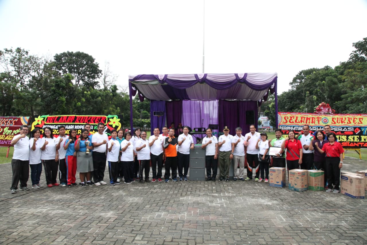 P SIANTAR | Bongkarnews.com – Peringatan Hari Koperasi ke-72 di Kota Pematangsiantar diisi berbagai kegiatan, di Lapangan H Adam Malik, Jumat (8/11). Meski hujan gerimis, namun warga Pematangsiantar tetap antusias mengikuti jalan santai, senam, dan perlombaan lainnya, plus lucky draw.