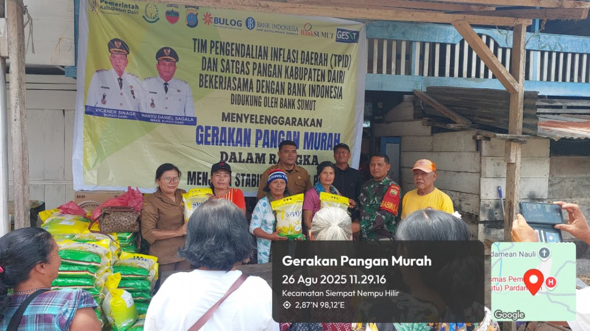 DAIRI | bongkarnews.com – Dalam rangka menjaga ketersediaan pasokan dan keterjangkauan harga komoditi pangan, Pemkab Dairi melalui Tim Pengendalian Inflasi Daerah (TPID) dan Satgas Pangan adakan Gerakan Pangan Murah (GPM) di 10 lokasi pasar kecamatan yang dimulai dari tanggal 8 – 27 Agustus 2025. Gerakan pangan murah dilaksanakan bekerajasama dengan Bulog KCP Kabanjahe, Polres Dairi serta di dukung oleh Bank Indonesia Perwakilan Provinsi Sumatera Utara.