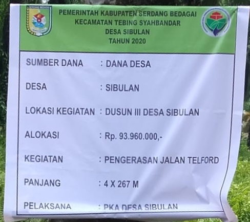 Pada tahun 2020, kegiatan pembangunan pengerasan jalan telford yang berada di dusun III Desa Sibulan ukuran 4 m x 167 m yang menghabiskan anggaran Dana Desa sebesar Rp 93.960.000 yang saat ini sudah rusak total atau kembali seperti jalan semula (tanah).