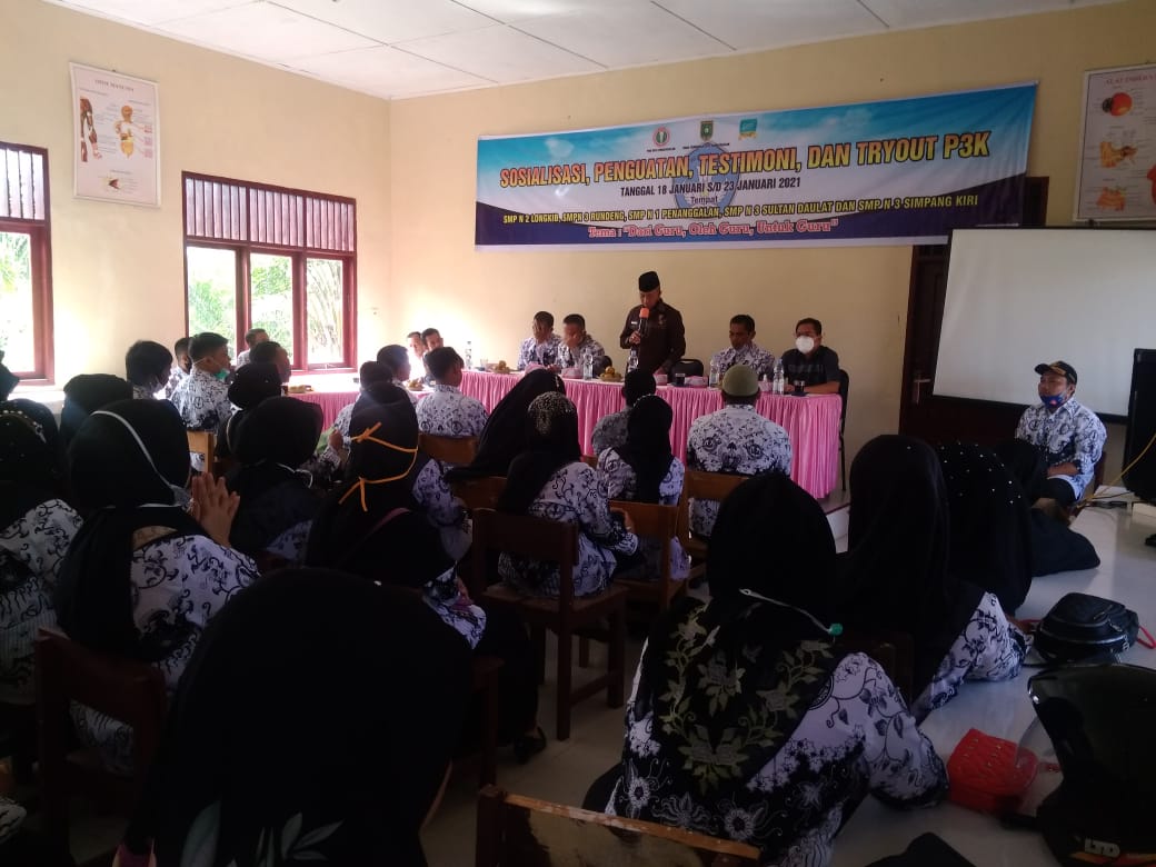 Dalam rangka sosialisasi tentang penguatan Testimoni dan Tryout P3K hari ke empat, dihadiri kadis pendidikan dan ketua PGRI serta sejumlah kepala sekolah dewan guru honorer yang bertempat di Ruang kelas SMPN 3 Sultan Daulat, Kamis (21/1/2021).