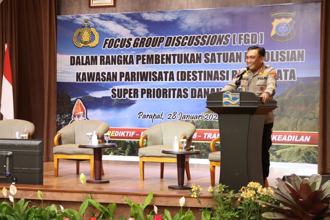 SIMALUNGUN I bongkarnews.com – Kapolda Sumatera Utara (Sumut) Irjen. Pol. Drs. R. Z. Panca Putra S, M.Si menghadiri sekaligus membuka langsung acara Focus Grup Discussions (FGD) dalam rangka Pembentukan Satuan Kepolisian Kawasan Pariwisata (Destinasi Pariwisata Super Prioritas Danau Toba) didampingi Kapolres Simalungun AKBP Nicolas Dedy Arifianto, S.H, SIK., yang bertempat di Aula Sopo Bolon Niagara Hotel, Parapat Kecamatan Girsang Sipangan Bolon, Kabupaten Simalungun. Jum’at (28/1/2022) sore sekira pukul 17.00 WIB.