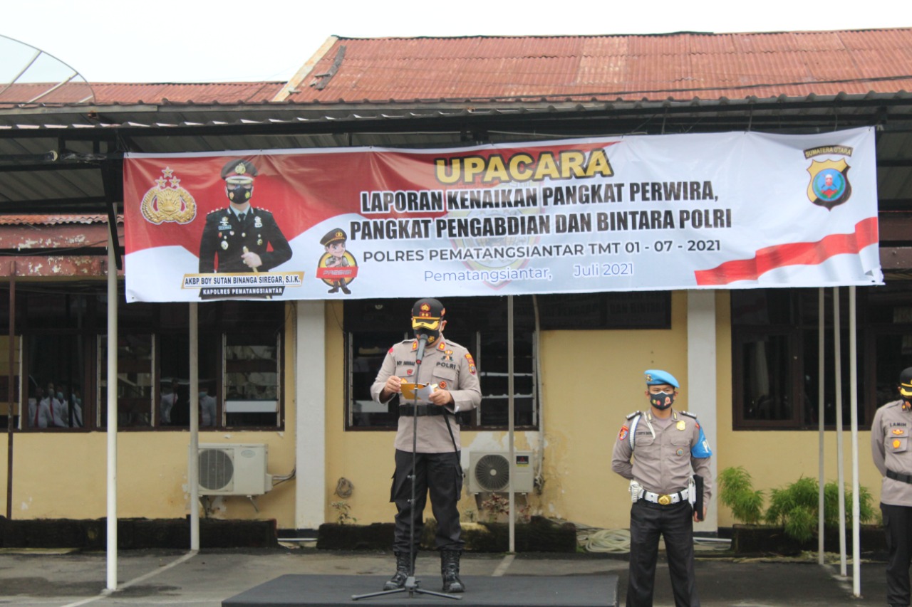 Pada kesempatan tersebut Kapolres Pematangsiantar menyampaikan apresiasi setinggi-tingginya kepada seluruh personil Polres Pematangsiantar yang naik pangkat hari ini, karena atas dedikasinya, loyalitasnya, dan prestasi kerja yang telah dilaksanakan dengan penuh rasa tanggung jawab dan secara terus menerus tidak terputus-putus di lingkungan Polri kepada seluruh personil agar menjauhi meninggalkan kegiatan yang bertentangan dengan pelanggaran disiplin terlebih lebih yang tersangkut dengan tindak pidana agar karir kepangkatan kita dalam kepolisian republik indonesia tidak terhalang, pupuk rasa kebanggaan diri untuk menjadi pelayan masyarakat.