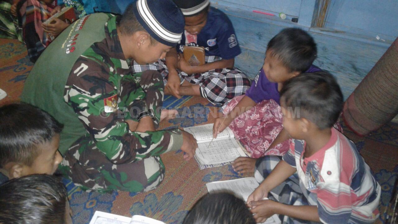 belasan anak – anak dengan tekun menirukan bacaan bahkan sesekali terhenti seraya mengeja huruf dibimbing Pratu Yasir Arafat. “Cik, ini seperti apa bunyinya”, terdengar salah satu anak-anak bertanya. Cik merupakan panggilan prajurit di Desa itu untuk pengertian Pakcik atau Paman.
