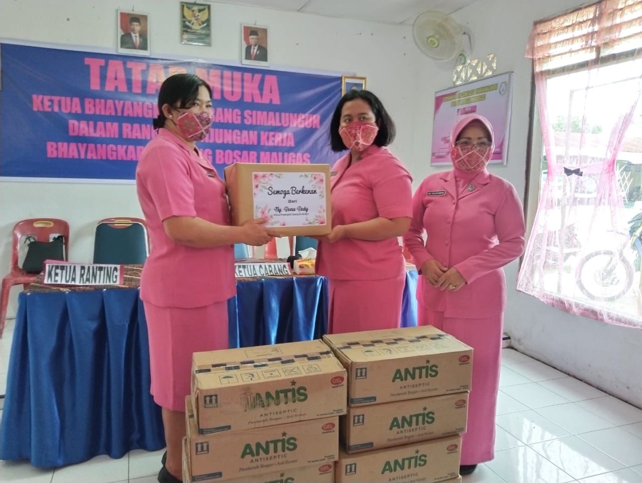 Pengurus Cabang Bhayangkari Simalungun memberikan bantuan berupa handsanitizer dan suplemen kesehatan bagi anggota Bhayangkari Ranting Bosar Maligas dan Anggota Bhayangkari Ranting Perdagangan.