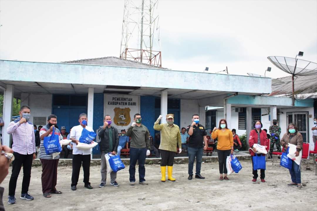 “Jadi hari ini kita salurkan bantuan sembako yang dananya berasal dari sumbangan gaji Pak Bupati, para ASN Pemkab Dairi dan pihak ketiga baik dalam bentuk dana maupun barang. Semoga bantuan ini bisa bermanfaat dan mari kita sama-sama mencegah penyebaran Covid-19, agar pandemi ini segera berlalu”, sebut Rahmat Syah.