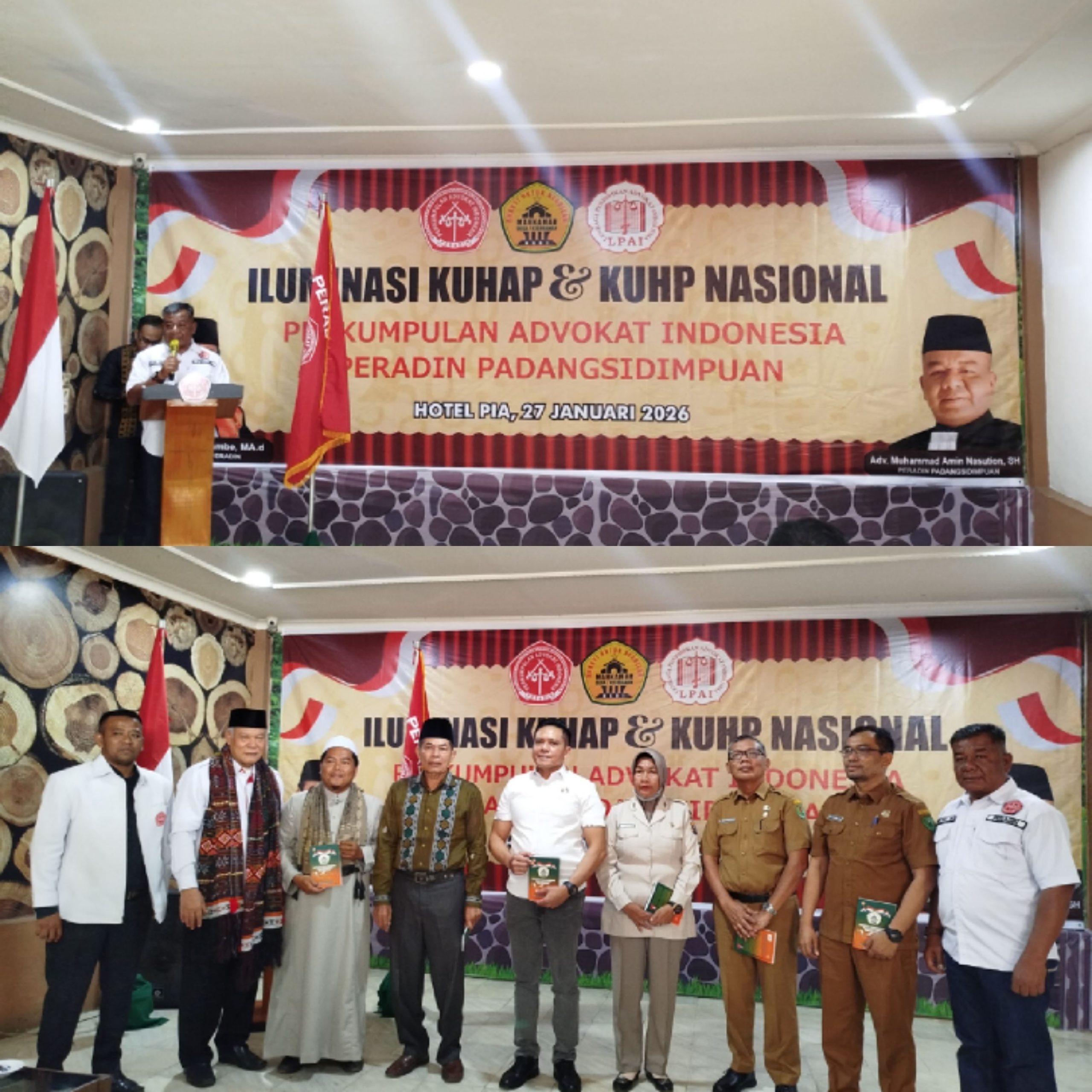 Perkumpulan Advokat Indonesia (PERADIN) Padangsidimpuan gelar sosialisasi Iluminasi Kitab Undang-Undang Hukum Acara Pidana (KUHAP) dan Kitab Undang-Undang Hukum Pidana (KUHP) Nasional yang dilaksanakan di aula Hotel PIA pada Selasa (27/01/2026).
