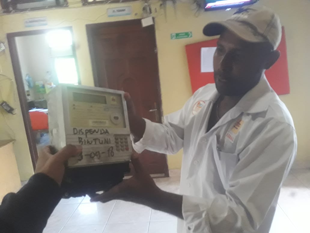 Foto : Petugas PLN Bintuni menunjukkan kwh meter Kantor BPD kepada wartawan di Kantor PLN.