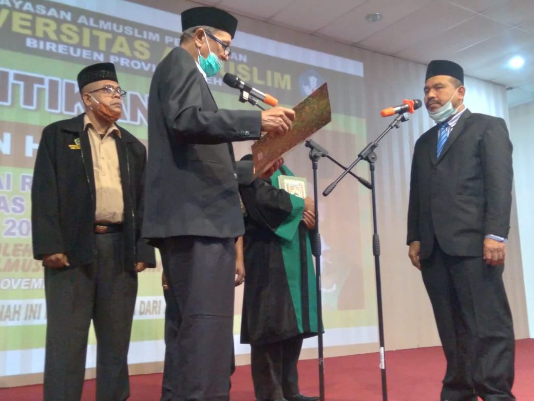 Bupati Bireuen. Dr. H. Muzakkar A. Gani, SH,M.Si, dalam sambutannya mengatakan, sebagai pimpinan Universitas Almuslim Peusangan, mengatakan Umuslim sudah selayaknya melahirkan guru besar, mengingat sebagai kampus besar, maka rektor yang baru harus mampu mewujudkan capaian tersebut, sekaligus membuka program studi magister.