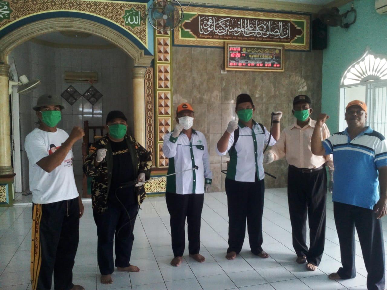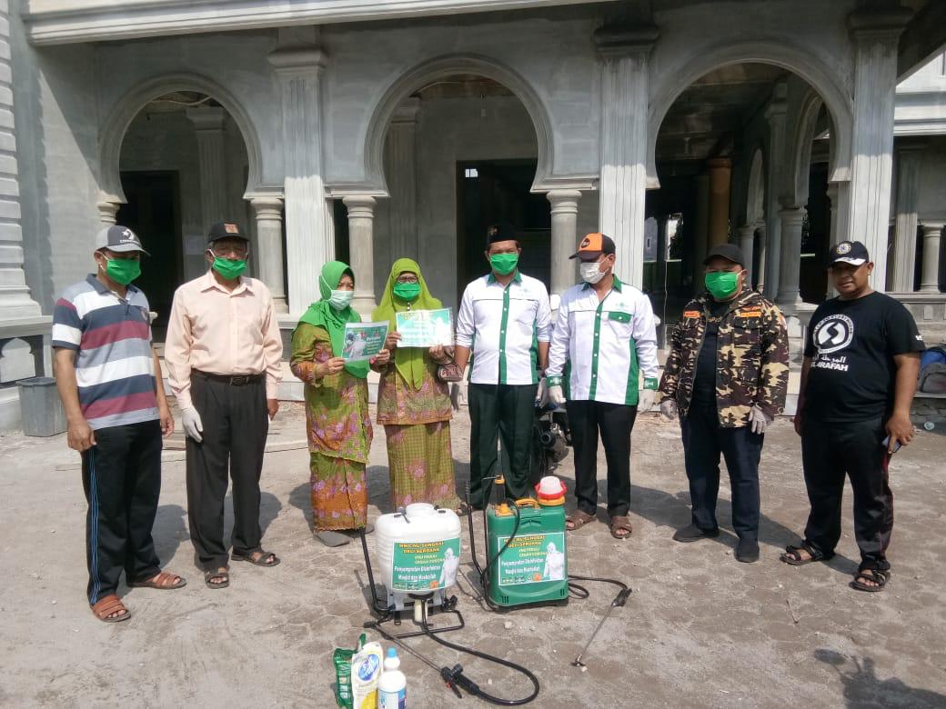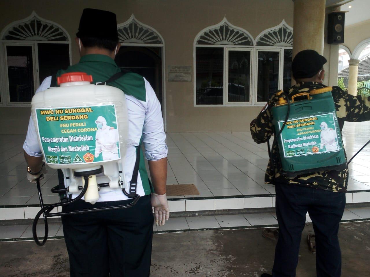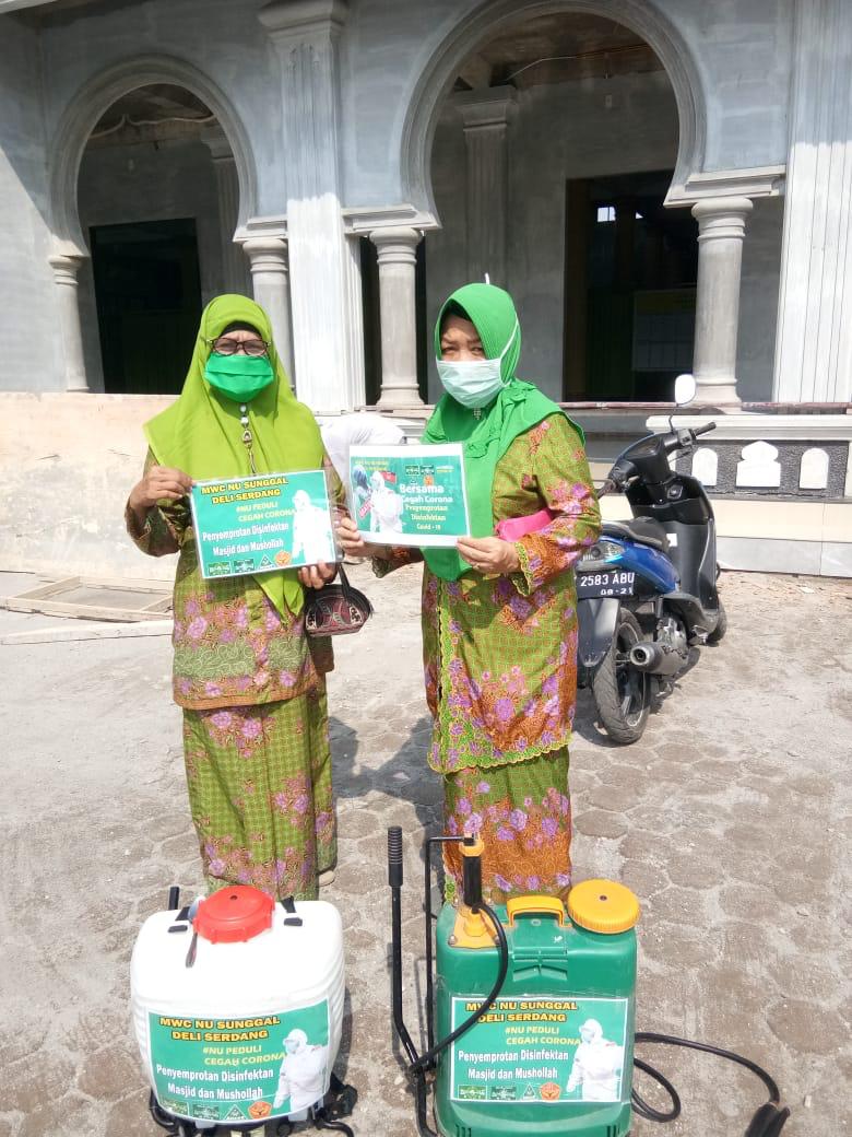 SUNGGAL | bongkarnews.com – MWC NU Sunggal, Kab Deli Serdang bersama Banomnya PAC Muslimat Sunggal dan PAC GP Ansor Sunggal melaksanakan kegiatan penyemprotan cairan Disinfectant di seluruh masjid dan mushollah seKecamatan Sunggal, Deli Serdang, Sabtu(28/03/2020).