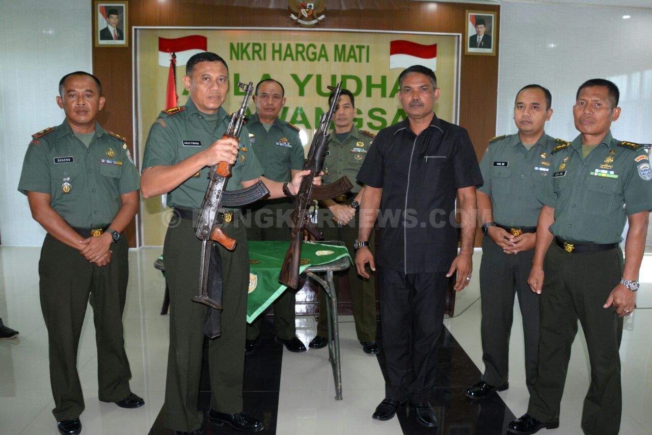 LHOKSEUMAWE | BN- Masyarakat Kabupaten Pidie dan masyarakat Kabupaten Aceh Utara melalui Dantim Intel Korem 011/LW Kapten Inf Wahid menyerahkan Dua Pucuk Senjata Api (Senpi), Lengkap Magazen dan Tiga Puluh Delapan Amunisi Aktif bekas konflik kepada Komandan Korem (Danrem) 011/Lilawangsa Kolonel Inf Agus Firman Yusmono, di Gedung Aula Yudha Korem 011/LW di Lhokseumawe, Senin (17/7/2017).