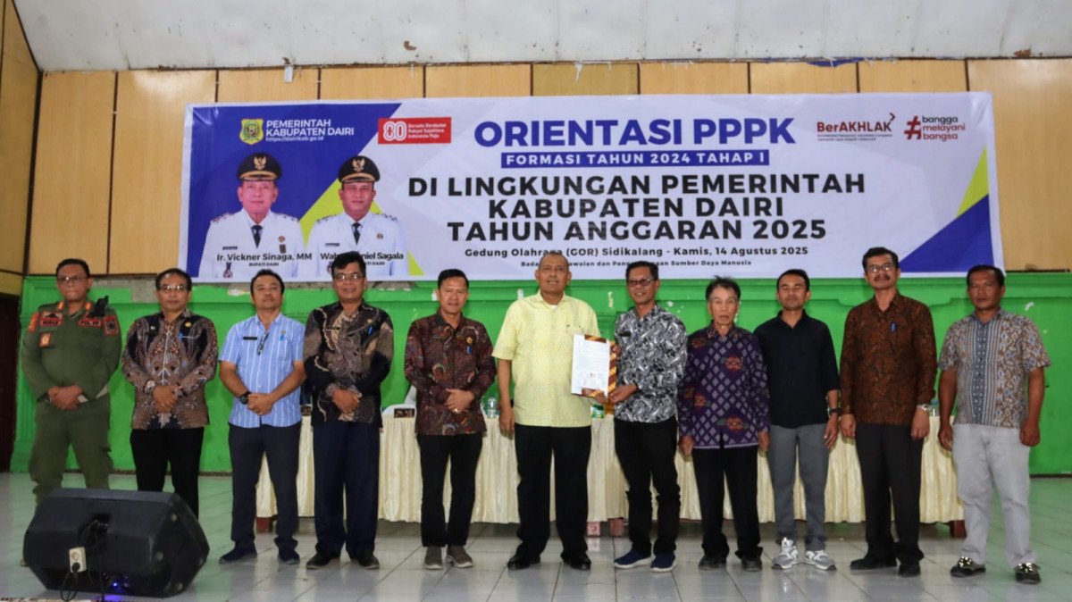 DAIRI | bongkarnews.com – Bupati Dairi Vickner Sinaga memberikan materi dalam orientasi PPPK tahun 2024 tahap I tahun anggaran 2025 pada Kamis (14/8/2025) di GOR Sidikalang. Dalam paparan materinya, Bupati Dairi menyampaikan materi tentang solusi out of the box guna pembangunan tetap berjalan agar Dairi naik kelas. Untuk mewujudkan hal tersebut, berbagai program pembangunan telah di tetapkan dalam RPJMD tahun 2025-2030.