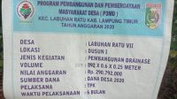 Kepala desa Labuhan Ratu VII kecamatan Labuhan Ratu kabupaten Lampung Timur , Sumarno saat ditemui awak media Bongkarnews.com di kediamannya Senin, (16/11/2020) mengatakan selaku aparatur pemerintahan desa, saat ini tengah melakukan pelaksanaan kegiatan pembangunan drainase sepanjang 892 M x0, 6×0,25 M dengan nilai volumenya sebesar Rp.290.792.000. terletak di dusun 1. Dan pembangunan gorong – gorong plat 6 meter X 6 unit dengan nilai volumenya sebesar Rp. 38.980.000. yang terletak di dusun 1.