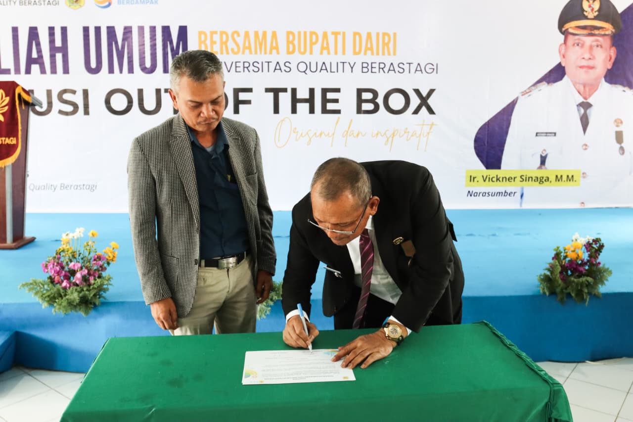 DAIRI | bongkarnews.com – Pemerintah Kabupaten Dairi bersama PT. PLN Persero Unit Pelaksana Pelayanan Pelanggan (UP3) Bukit Barisan melakukan penandatanganan komitmen bersama terkait kerjasama yang sinergis dalam peningkatan kesejahteraan masyarakat melalui penyediaan tenaga listrik yang handal dan berkelanjutan pada Selasa (26/8/2025) pada sela sela kegiatan kuliah umum di Universitas Quality Berastagi.