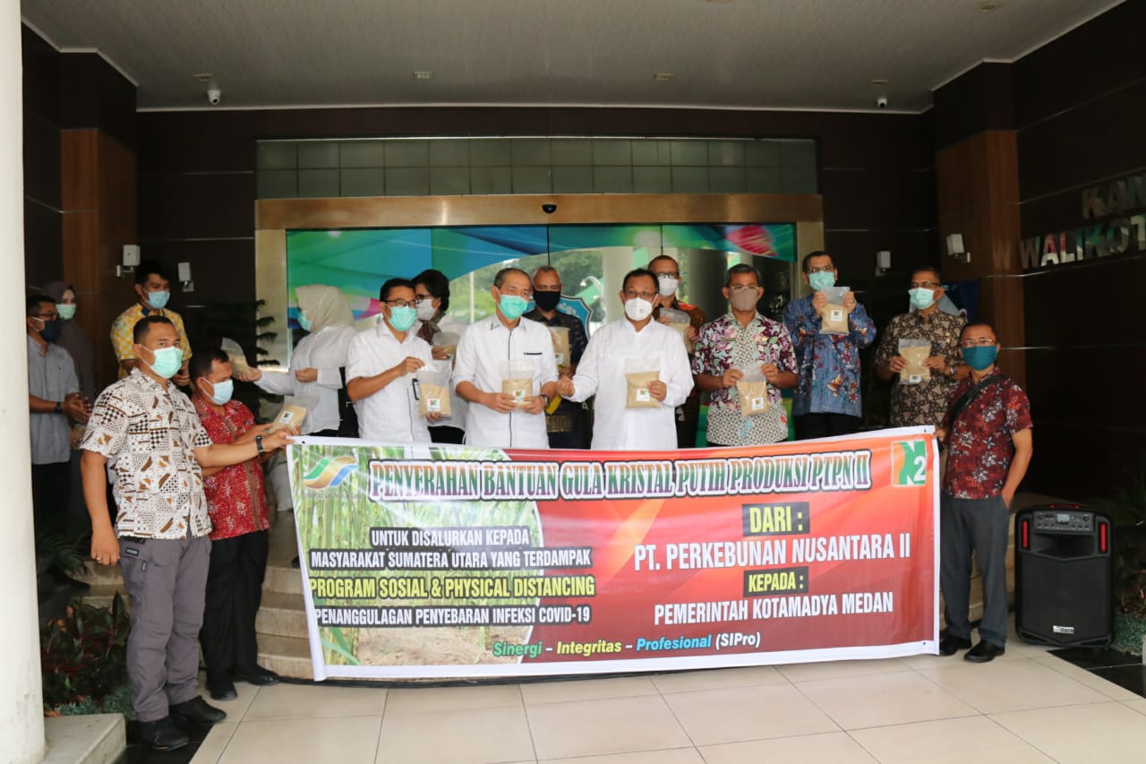 Pelaksana tugas (Plt) Wali Kota Medan, Ir H Akhyar Nasution MSi menerima bantuan langsung yang diserahkan Direktur Komersial PTPN II , Muhammad Arwin Nasution. Selain Sekda Kota Medan, Ir Wiriya Alrahman MM, penyerahan gula pasir juga disaksikan sejumlah pimpinan organisasi pimpinan daerah (OPD) di lingkungan Pemko Medan.