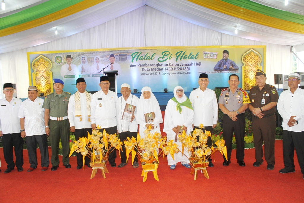 Medan | Bongkarnews.com- Wali Kota Medan Drs H T Dzulmi Eldin S MSi menepungtawari sebanyak 2.407 orang calon jemaah haji (calhaj) adal Kota Medan di Lapangan Merdeka Medan, Rabu (18/7). Acara ini digelar sebagai bentuk syukuran yang dilaksanakan untuk memberikan doa retu kepada para calhaj semoga segala rintangan dan cobaan yang dihadapi selama menunaikans leuruh rukun ibadah jaji di Tanah Suci. Di samping itu juga untuk menguatkan iman calhaj agar mereka menjadi hamba yang semakin dicintai Allah SWT.