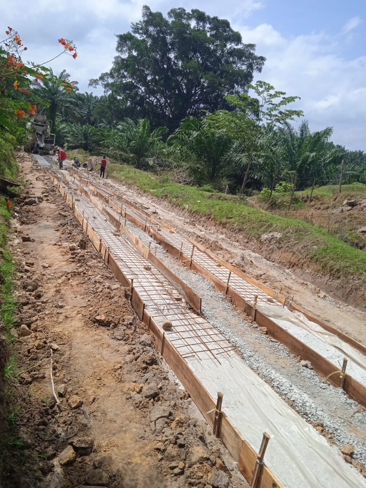 Di lapangan awak media mendapat kejanggalan dimana pengerjaan pengecoran jalan beton cor betina dengan lantai cor beton setebal 5 cm campuran 1 pc : 4 ps : 6 kr pecah ukuran batu 2-3 cm,dilakukan trial mix campuran beton cor betina mutu K 225 dengan pemasangan besi wire mesh 8 m secara single dengan jarak terlampir seperti gambar kerja tidak mempunyai kawat pengikat besi wire mesh.