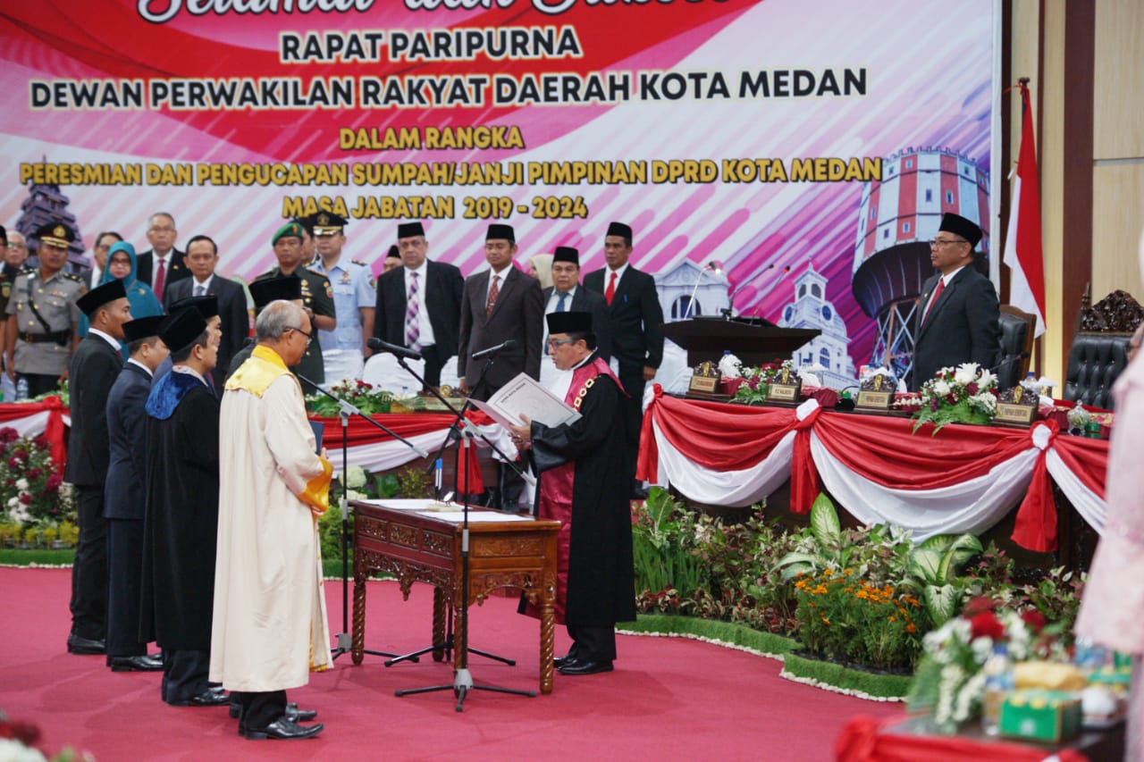 Penetapan pimpinan DPRD Medan dilakukan dalam Rapat Paripurna dalam rangka dalam rangka Peresmian dan Pengucapan Sumpah/Janji Pimpinan DPRD Medan Masa Jabatan 2019-2024 dengan penuh khidmat di Gedung DPRD Medan, Jumat (8/11). Ketua Pengadilan Negeri (PN) Kelas IA Khusus Dr Djaniko Girsang SH MH bertindak untuk mengambil sumpah janji empat pimpinan DPRD Medan.
