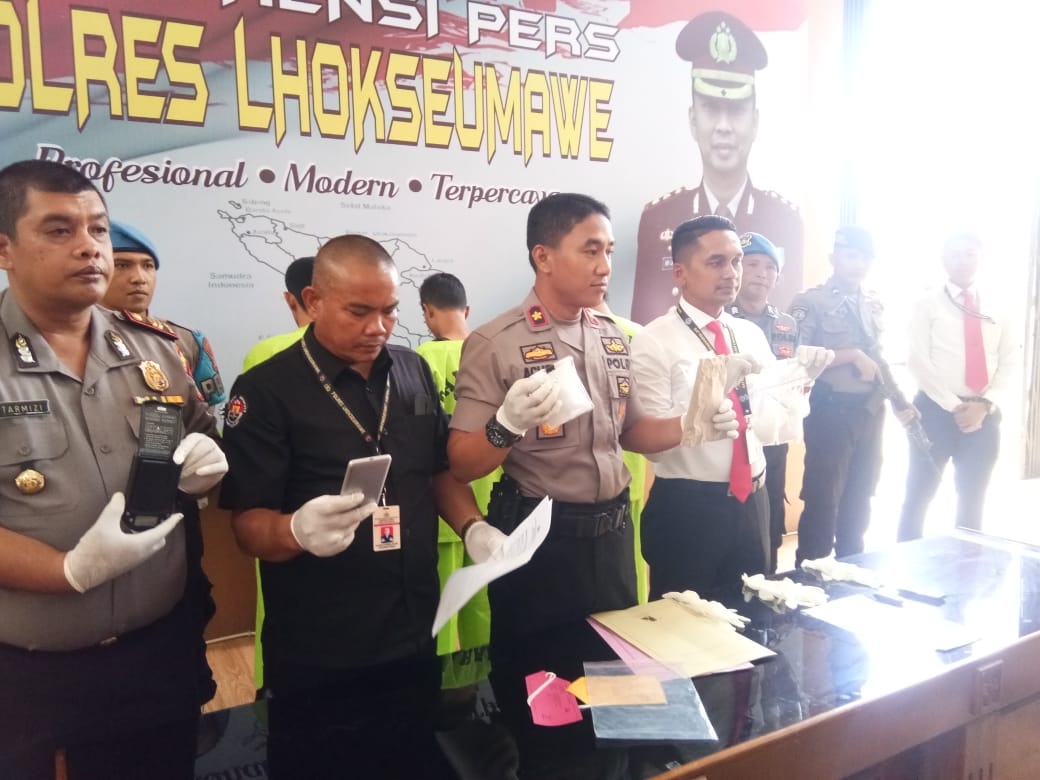 Keberhasilan dibekuk satu dari tiga tersangka tersebut, yakni berinisial BR (36) sebagai kurir sabu dibekuk pada (28/01/20) di kawasan Keude Bungkah, Kecamatan Muara Batu, Kabupaten Aceh Utara, bersama barang bukti delapan bungkus paket sabu dengan jumlah berat 26 gram.”ujar Kapolres Lhokseumawe AKBP Ari Lasta Irawan melalui Waka Polres Kompol Ahzan saat konferensi pers di Mapolres Lhokseumawe, Senin (3/2).