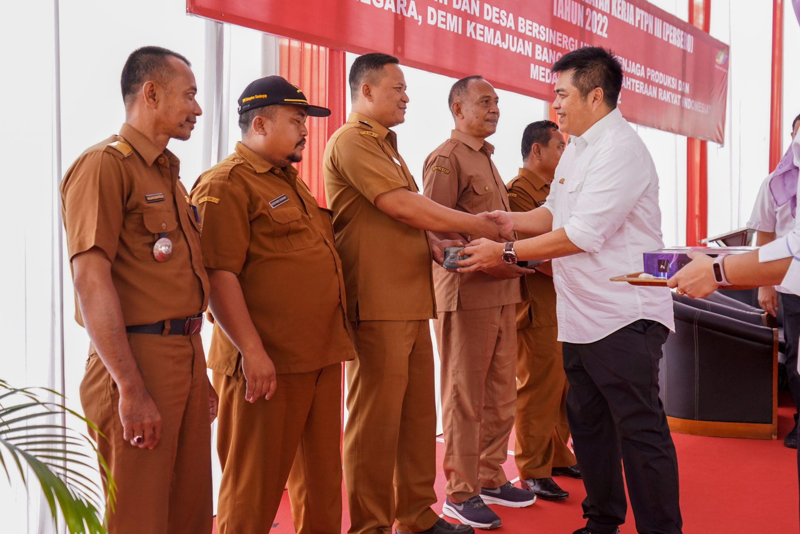 300 Kepala Desa dan Perangkat Desa dari seluruh wilayah kerja PTPN III (Persero) yang langsung disambut oleh Manajemen PTPN III (Persero), dalam hal ini diwakili oleh SEVP Bussiness Support Tengku Rinel dan Kepala Bagian Umum DR. Christian