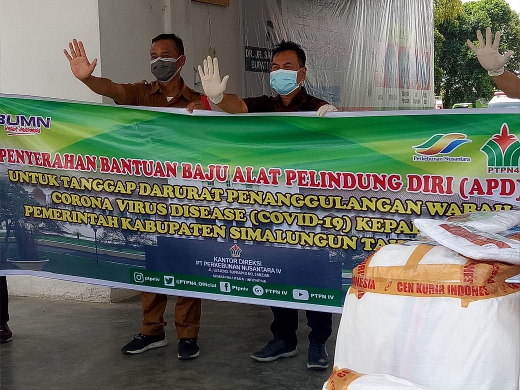 SIMALUNGUN I bongkarnews.com- Pihak PTPN IV kembali memberikan bantuan berupa 500 pcs APD ke Gugus Tugas Percepatan Penanganan Corona Virus Diases (Covid-19) di Posko Tanggap Darurat Jalan Asahan, Kamis (14/5/2020).