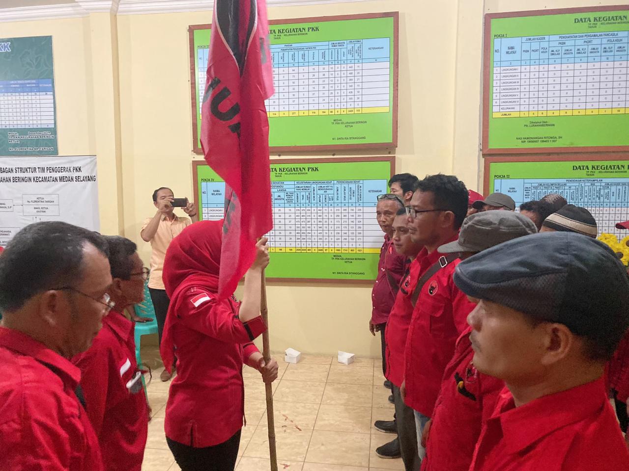 MEDAN | bongkarnews.com – Hj Fitriani Manurung SPd MPd selaku kordinator kecamatan, secara simbolis memberikan bendera merah berlambang banteng PDI Perjuangan kepada salah seorang ketua terpilih mewakili 6 kelurahan di acara pelantikan Ranting PDI Perjuangan se-Kecamatan Medan Selayang.