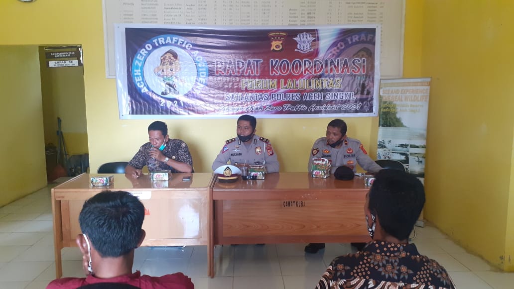 Kasat Lantas Polres Aceh Singkil .IPTU Mulyadi, S.H., M.H. dalam acara forum rapat koordinasi . menghimbau terhadap masyarakat kecamatan Kuala Baru agar supaya mematuhi peraturan lalulintas agar terlealisasi nya Aceh Zero Traffic Accident 2021 di kabupaten Aceh Singkil.sehingga dapat menekan dan menurunkan lakalantas di wilayah hukum polres Aceh Singkil.