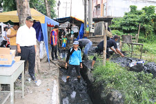 Pada saat dilakukan pengorekan, kondisi drainase tampak sudah mengalamin penyubatan akibat sampah dan lumpur. Perhalan air yang tadinya tersumbat mulai mengalir dengan lancar ketika sampah-sampah dan lumpur diangkat oleh petugas dengan menggunakan cangkul dan sekop. Tidak hanya itu saja untuk memastikan tidak ada lagi sumbatan, petugas juga membongkar lapak-lapak pedagang yang berada diatas drainase agar aliran drainase dapat terkontrol dengan baik.