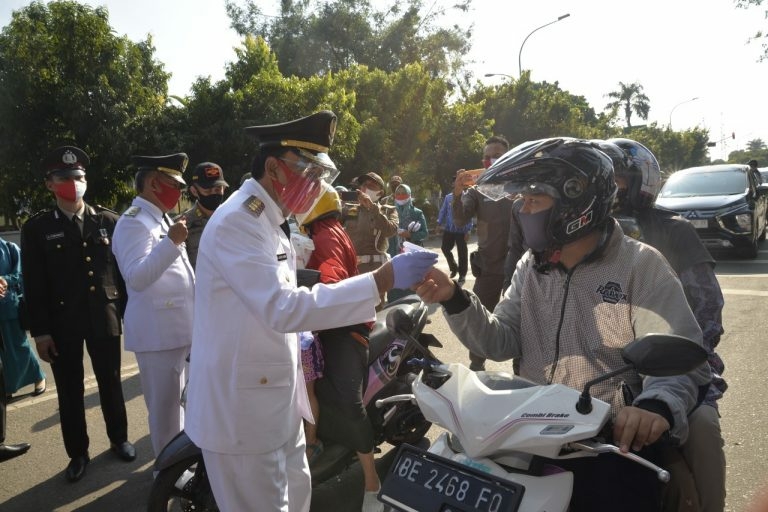 METRO I bongkarnews.com- – Usai gelar upacara peringatan HUT RI ke- 75, Walikota Metro Achmad Pairin beserta Fokorpimda dan anggota penggerak PKK Kota Metro membagikan masker kepada masyarakat di Jl. A.H Nasution, Senin (17/08/2020).