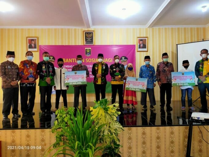 METRO I bongkarnews.com – Walikota Metro hadiri penyerahan secara simbolis bantuan sosial kepada Lembaga Kesejahteraan Sosial (LKS) dan Lembaga Kesejahteraan Sosial Anak (LKSA), di LKSA Budi Utomo, Ganjar Asri, Kamis (15/04/2021).