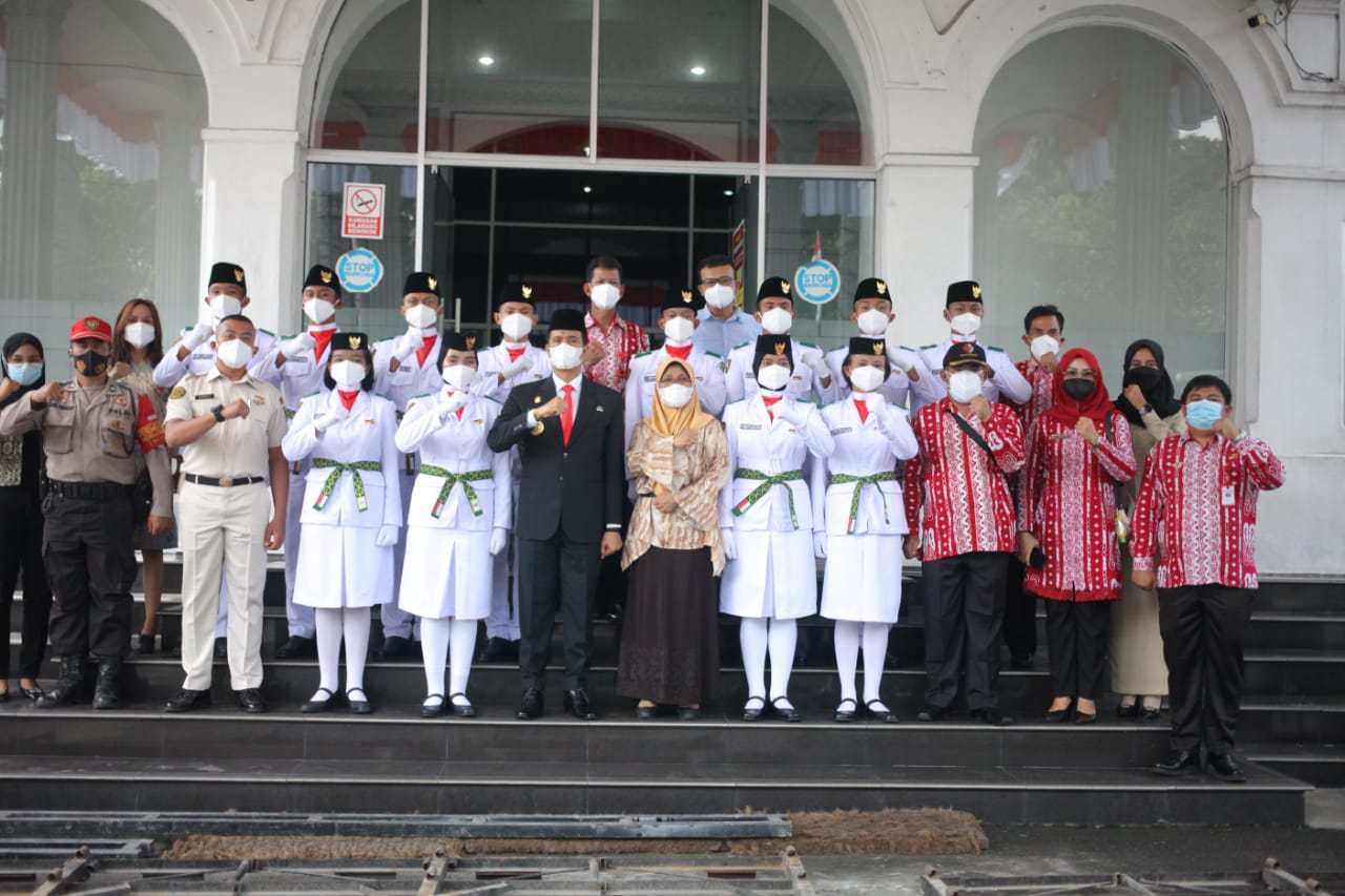 SIANTAR I bongkarnees.com- Walikota Pematangsiantar Dr H Hefriansyah SE MM mengukuhkan 12 anggota Pasukan Pengibar Bendera (Paskibra) yang akan bertugas di peringatan Hari Ulang Tahun (HUT) ke-76 Kemerdekaan Republik Indonesia, Selasa (17/8/2021). Pengukuhan dilaksanakan di Ruang Data Pemerintah Kota (Pemko) Pematangsiantar, Jumat (13/8/2021).